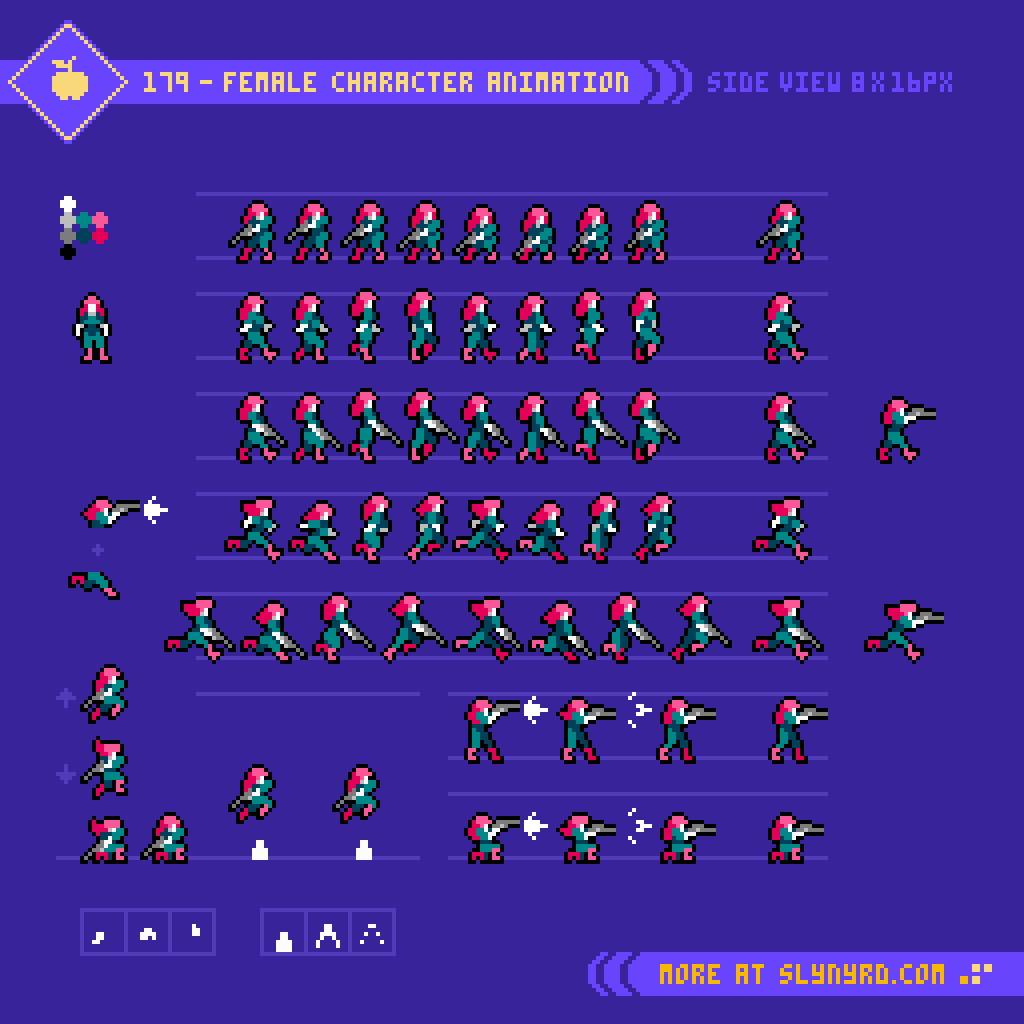 The female character design also closely conforms to the dummy, but has long hair, and the clothing slightly puffs up the shoulders in some poses. As with the male, the hair animates along with the run, and jump, but with slightly more involved movement to accommodate the fuller length. Additionally, it felt appropriate to add some movement to the hair during the shooting action. This hair movement applies to all shooting combinations, except for when running. I felt the rhythmic bounce of the hair while running should override the shooting hair flip, as it provides a nice lively rhythm with less noise. As for shooting while jumping, I tinkered a couple pixels so it feels neutral for both up and down states. If the level design permits prolonged moments of falling, I might make distinct shoot frames for the falling state, but otherwise there would rarely be more than a split second to shoot while falling.